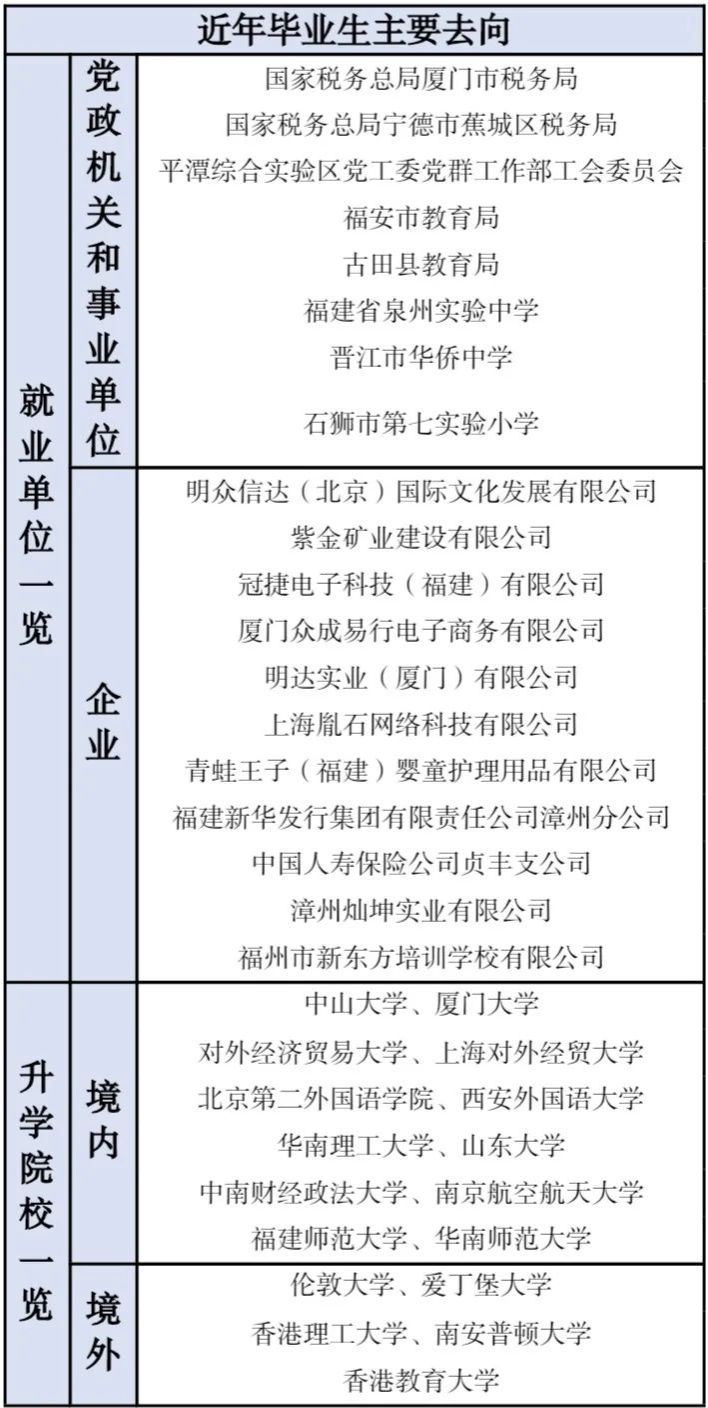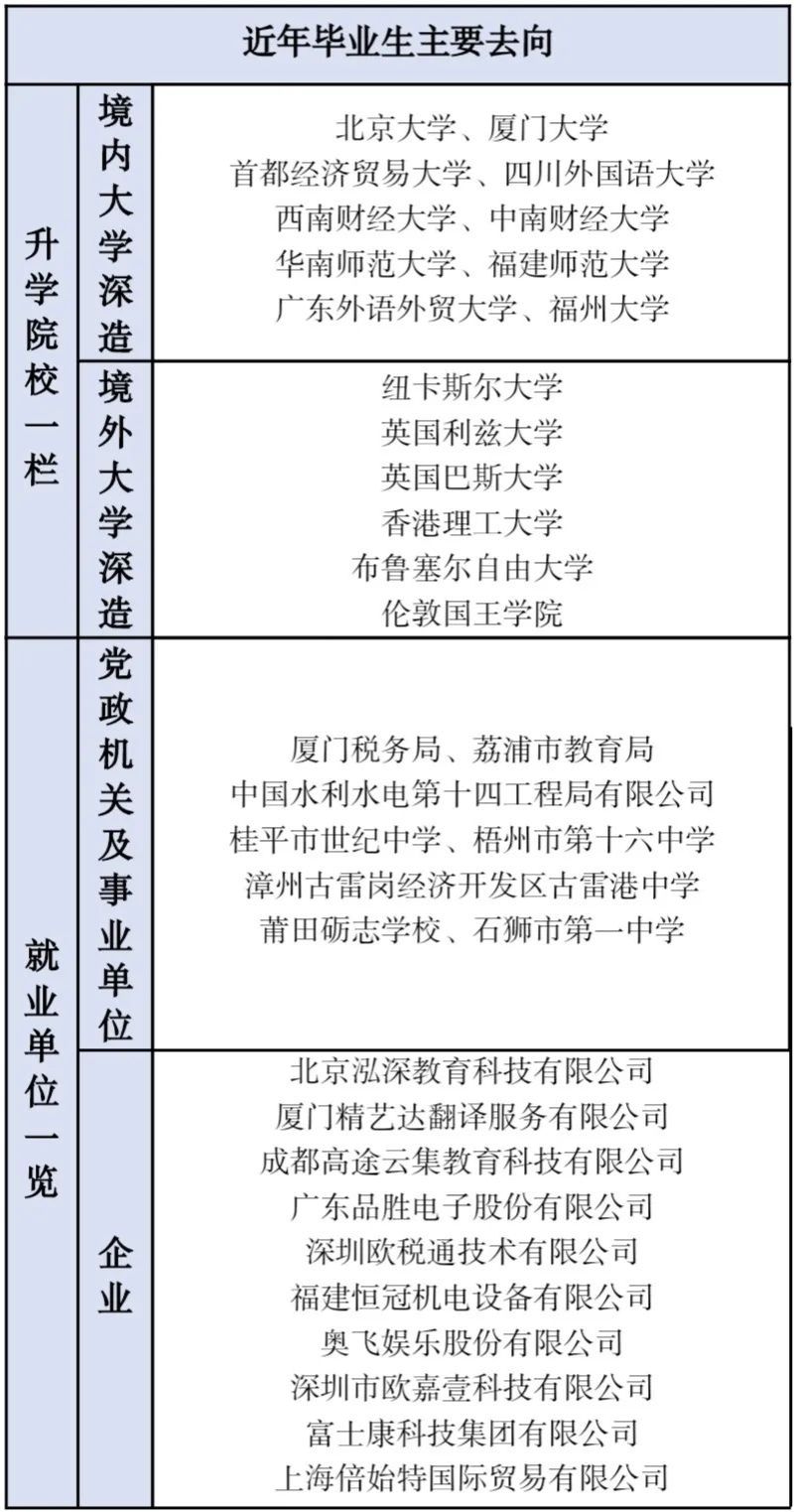 的前身为福建省第二师范学院英语系,现有英语(师范)、商务英语、 翻译、日语4个全日制本科专业,学科教学(英语)、翻译专业硕士2个专业学位硕士点,在校本、硕学生1300余人。英语(师范)专业于2012 年获批为省级专业综合改革建设点,2021年获批为国家级一流本科专业建设点,并于同年顺利通过教育部普通高等学校师范类专业中学英语二级认证。商务英语专业位列《全国商务英语基础教育质量综合指数100强榜单》第22位。学院现有国家级精品在线开放课程1门,国家级一流本科课程(线下)1门,省级一流本科课程(线下)1门,省级一流本科课程(线上)2门,省级课程思政优秀教学案例1项。