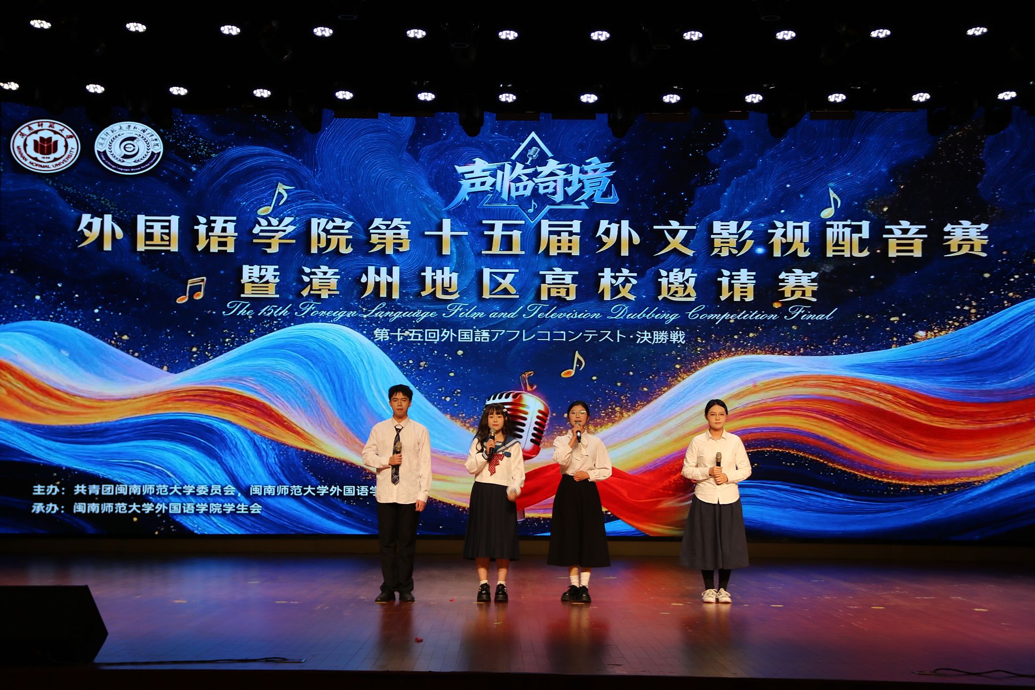 11月23日,闽南师范大学第十五届“声临奇境”外文影视配音赛暨漳州地区高校邀请赛在我校闽南文化艺术中心多功能厅圆满收官,来自漳州地区的5所高校共500余名同学组成200余支队伍参赛,共同打造一场“语言美”和“文化美”的视听盛宴。